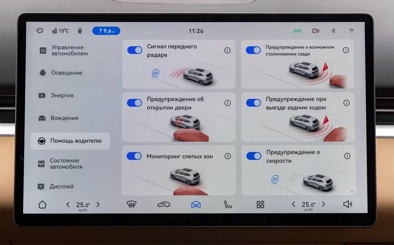 Под экономию горючего Evolute i-Space заточен с рождения: предусмотрены режимы хода — на чистой электротяге, с приоритетом использования батареи, умный и с приоритетом зарядки от ДВС. Регулируется через экран и принудительный уровень зарядки батареи: от 18 до 80%.