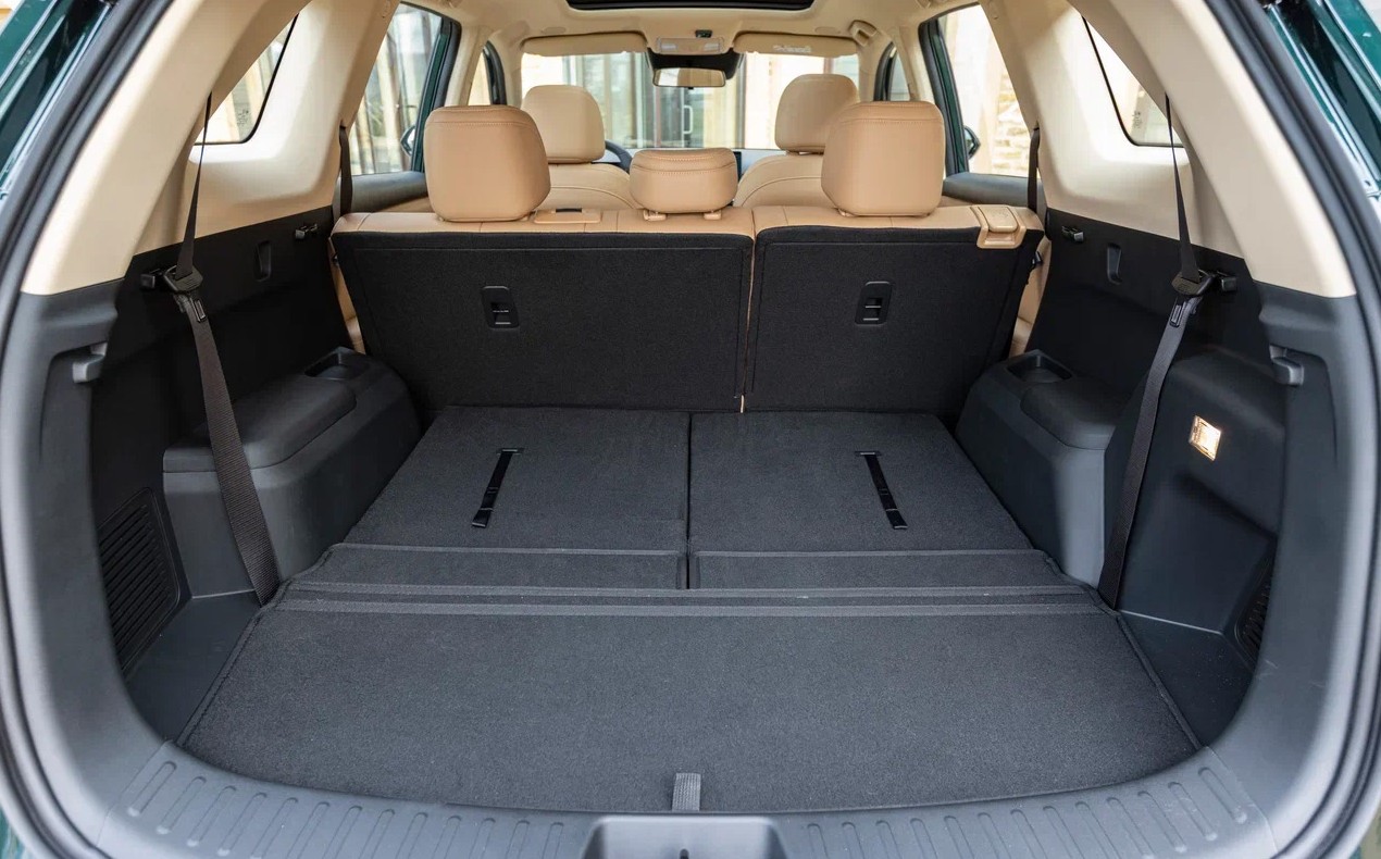 И дорестайлинговый Evolute i-Space за объем багажника упрекнуть было сложно, а обновленец и вовсе метит в чемпионы. Сложив третий ряд кресел, можно нарастить объем «трюма» со стандартных 187 до 934 л, а лучше — приобрести прежде недоступный пятиместный вариант. В такой конфигурации под фальшполом прячется пара вместительных ниш: хоть зарядные кабели клади, хоть трос для буксировки. При сложенном втором ряде сидений в таком автомобиле можно легко перевезти морозильную камеру: 2125 л объема и широченная дверь — прекрасное тому подтверждение.