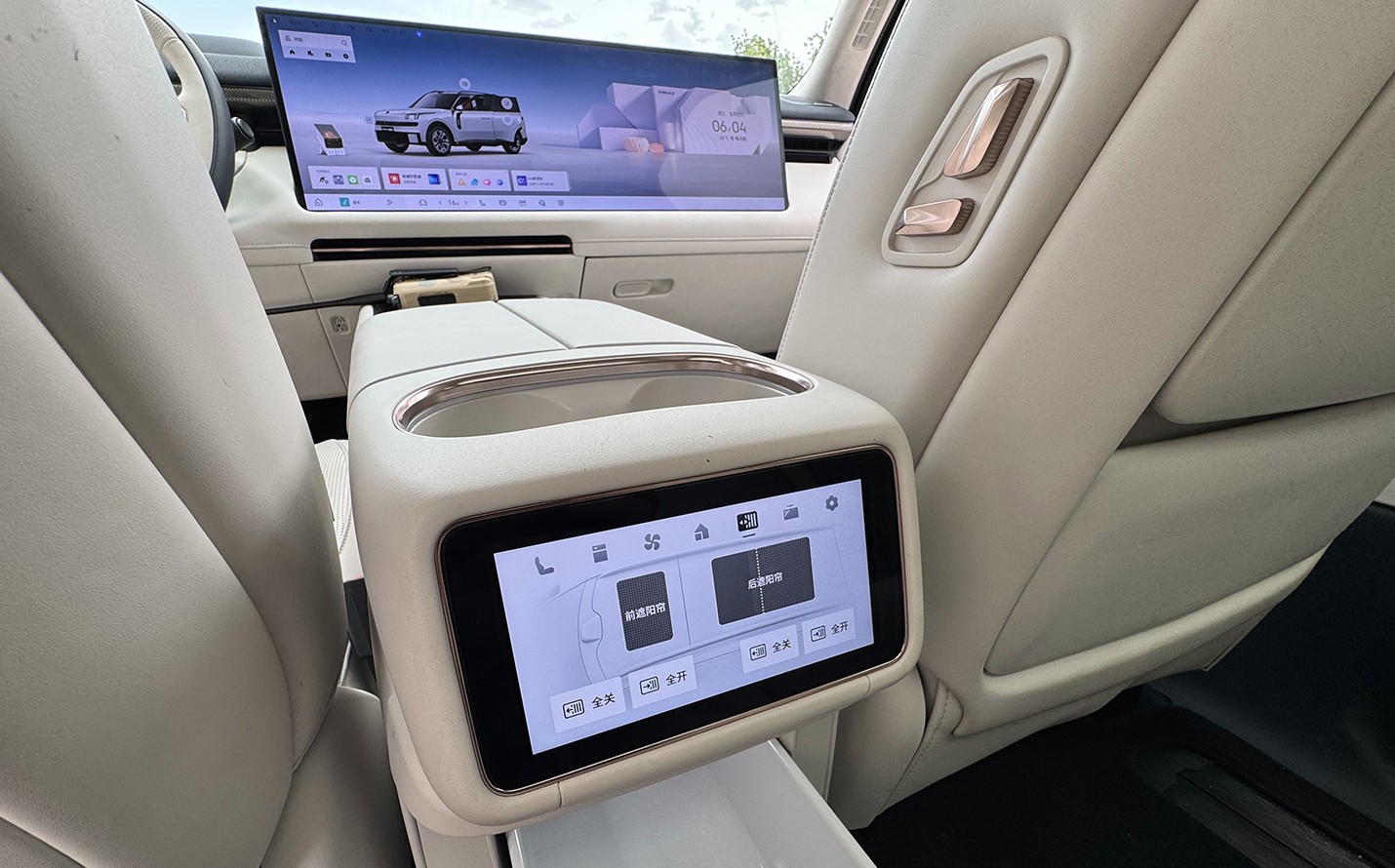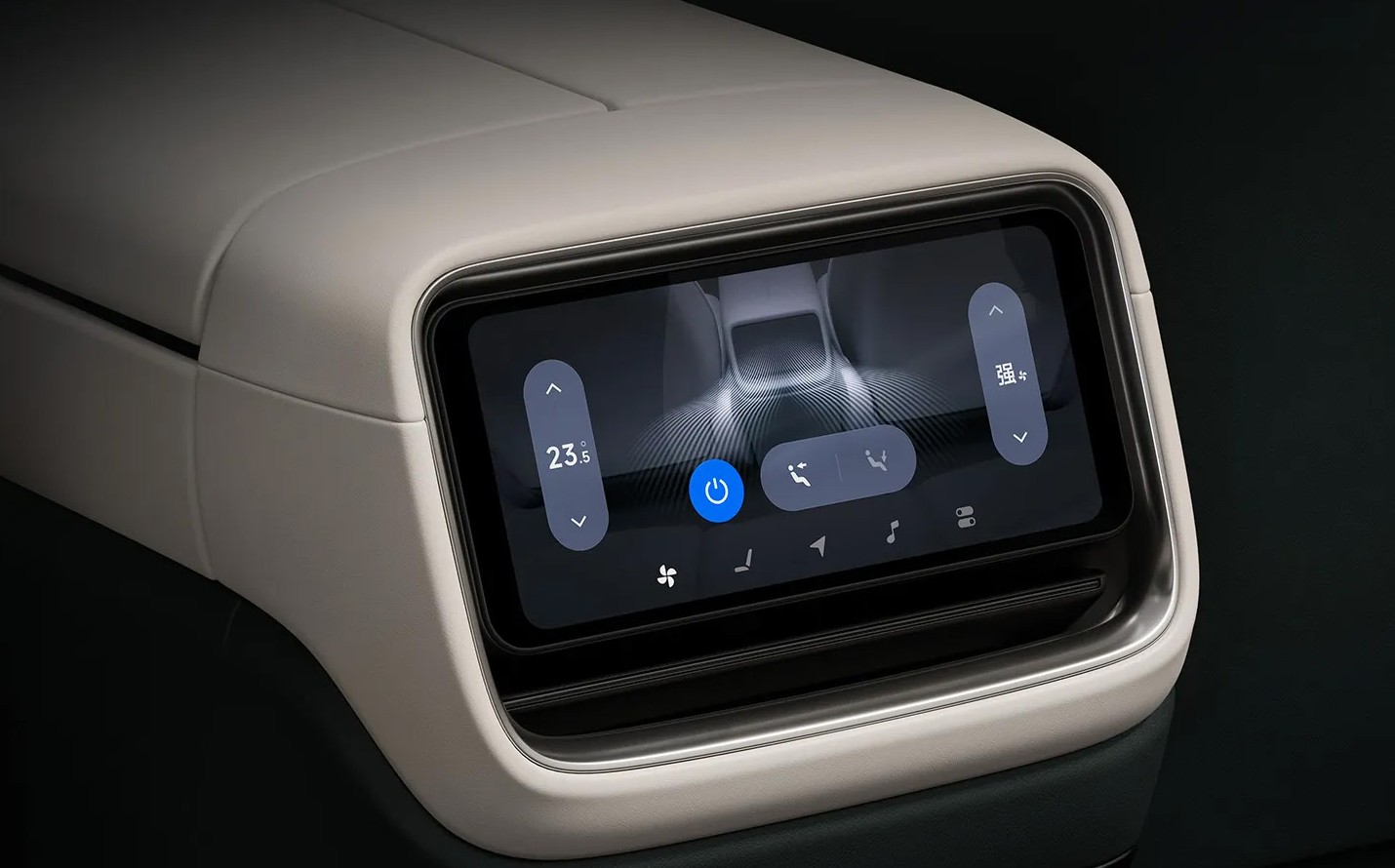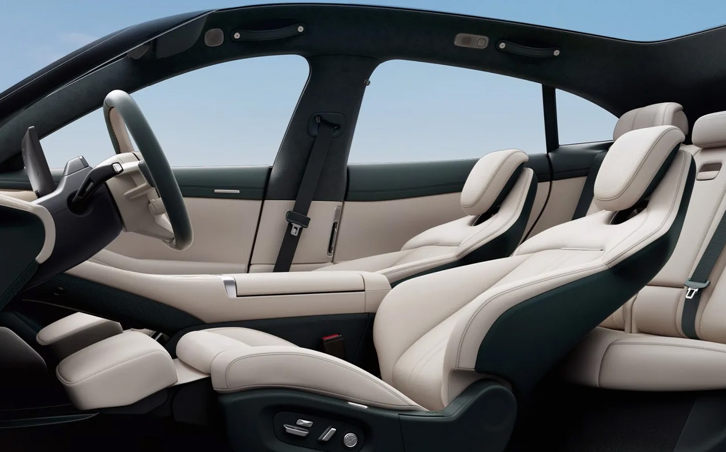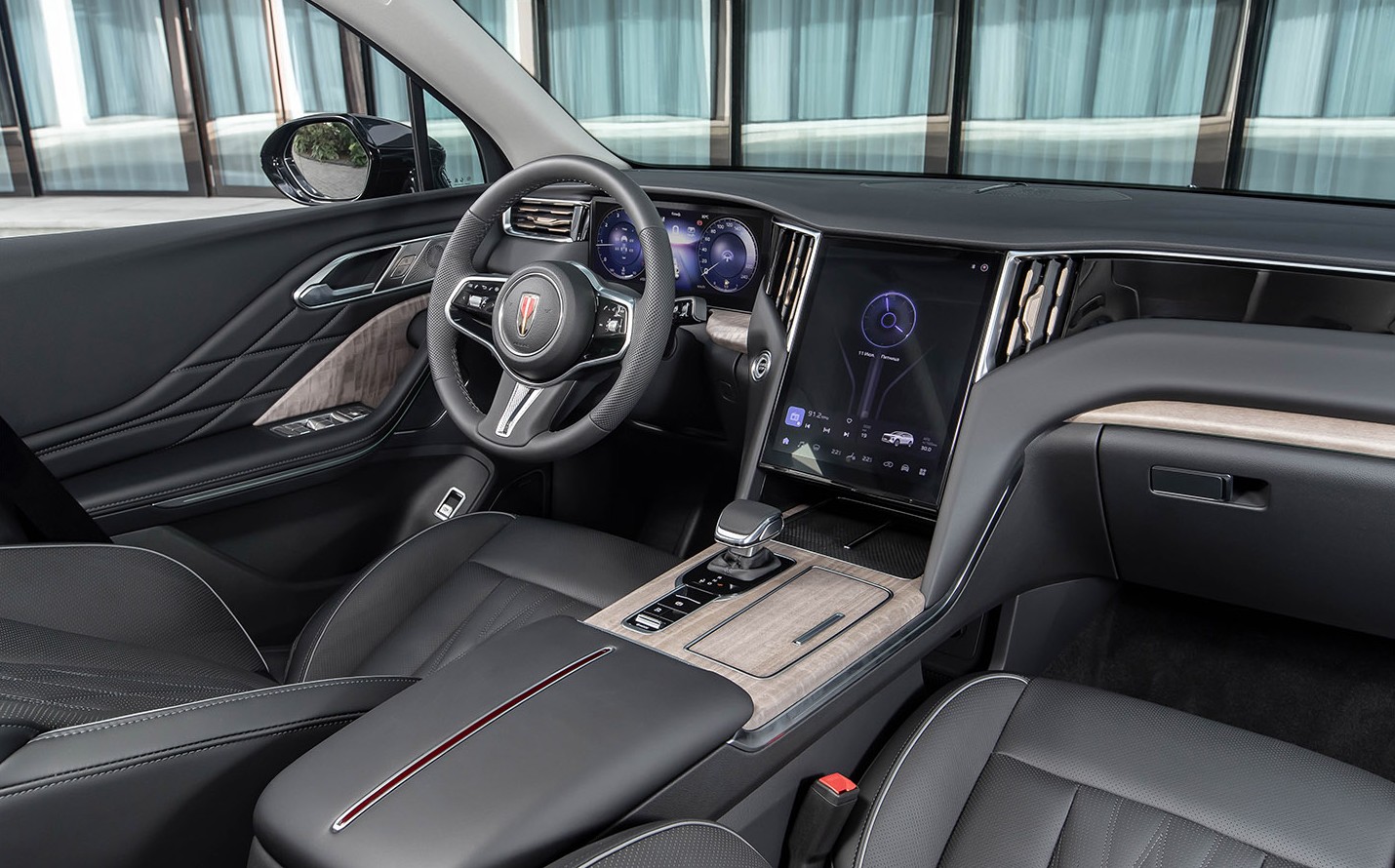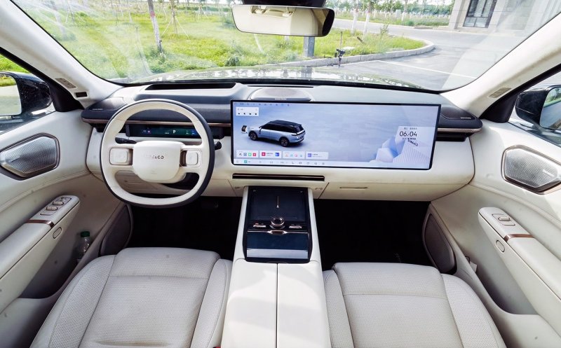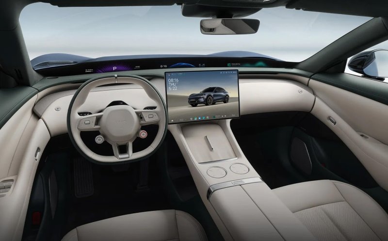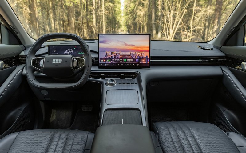 В салоне царит минимализм, но функциональный: справа от водительского места установлен 16,1-дюймовый экран, а под ветровым стеклом простирается огромная, 43,3-дюймовая, панель, на которую выводятся данные навигации, скорость и работа бортовых систем.