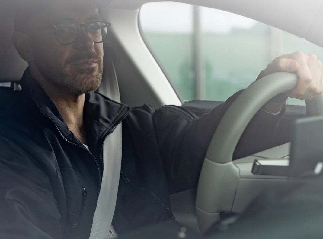 новое рулевое колесо — с толстыми горизонтальными спицами и большими сенсорными поверхностями для управления функциями автомобиля; элементы управления на спицах руля, вероятно, сенсорные или тактильные (не физические): слева — функции звонков и голосового управления, справа — настройки круиз-контроля; модуль подушки безопасности расположен ниже, чем обычно; за рулем — два крупных рычага квадратной формы: левый отвечает за свет, поворотники и дворники, правый — за выбор режимов движения (R/N/D/P); минималистичная приборная панель с большим изогнутым экраном мультимедиа и приборной панелью без физических шкал.
