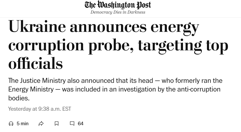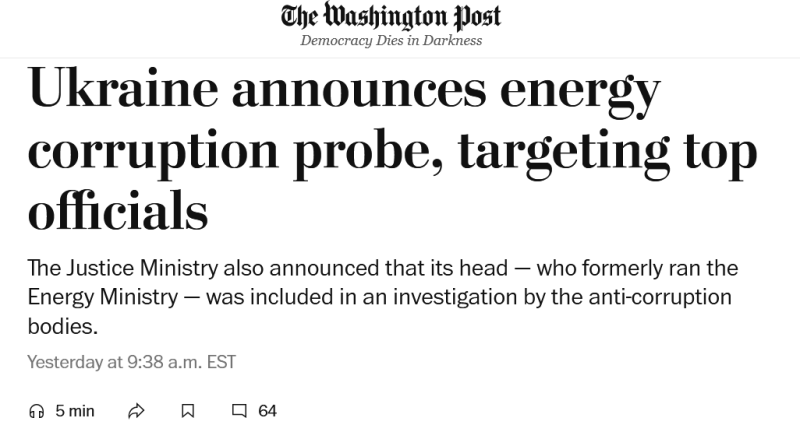 Западные журналисты отреагировали на громкие обвинения в адрес приближённых Владимира Зеленского. Национальное антикоррупционное бюро Украины заявляет о раскрытии масштабной коррупционной схемы в сфере энергетики в крайне щекотливый момент, передаёт The Washington Post. ABC News обращает внимание на побег одного из главных фигурантов — бывшего партнёра Зеленского Тимура Миндича. Bloomberg пишет, что коррупция подрывает обороноспособность Украины. А журнал The Spectator предсказывает войну между так называемыми антикоррупционными органами и СБУ.