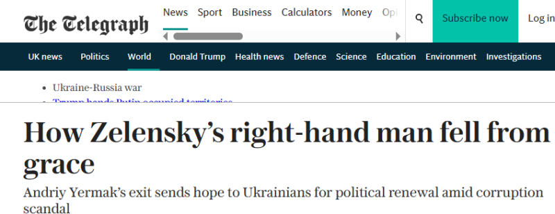 «Андрей Ермак был главным переговорщиком Зеленского в ходе взаимодействия с союзниками Украины, — отмечает агентство. — Его отставка на фоне разгорающегося коррупционного скандала происходит как раз в тот момент, когда Дональд Трамп, чтобы положить конец... боевым действиям, подталкивает Украину пойти на уступки России, а силы Зеленского (ВСУ. — RT) сталкиваются с нехваткой вооружений и финансирования».