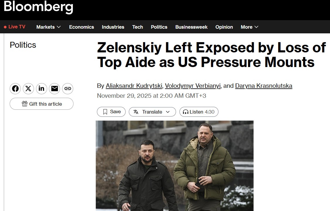Как сообщает Bloomberg, Зеленский оказался в уязвимом положении из-за потери высокопоставленного помощника.