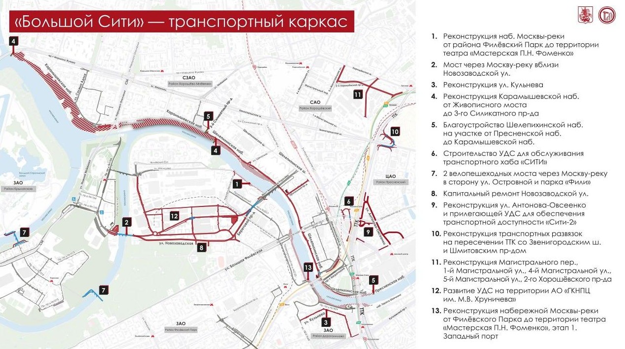 В рамках создания "Большого Сити" в Москве уже построили 35 км дорог, мостов, путепроводов, эстакад и подземных переходов. В перспективе – ещё 18 км дорог, включая проекты реконструкции ключевых улиц и создания новых транспортных развязок. Ведут реконструкцию набережной Москвы-реки от театра "Мастерская Петра Фоменко" до района Филёвский парк. Также строят мост-парус у Новозаводской улицы, благоустраивают Шелепихинскую набережную и формируют улично-дорожную сеть транспортного хаба "СИТИ". В рамках проекта возводятся два велопешеходных моста.