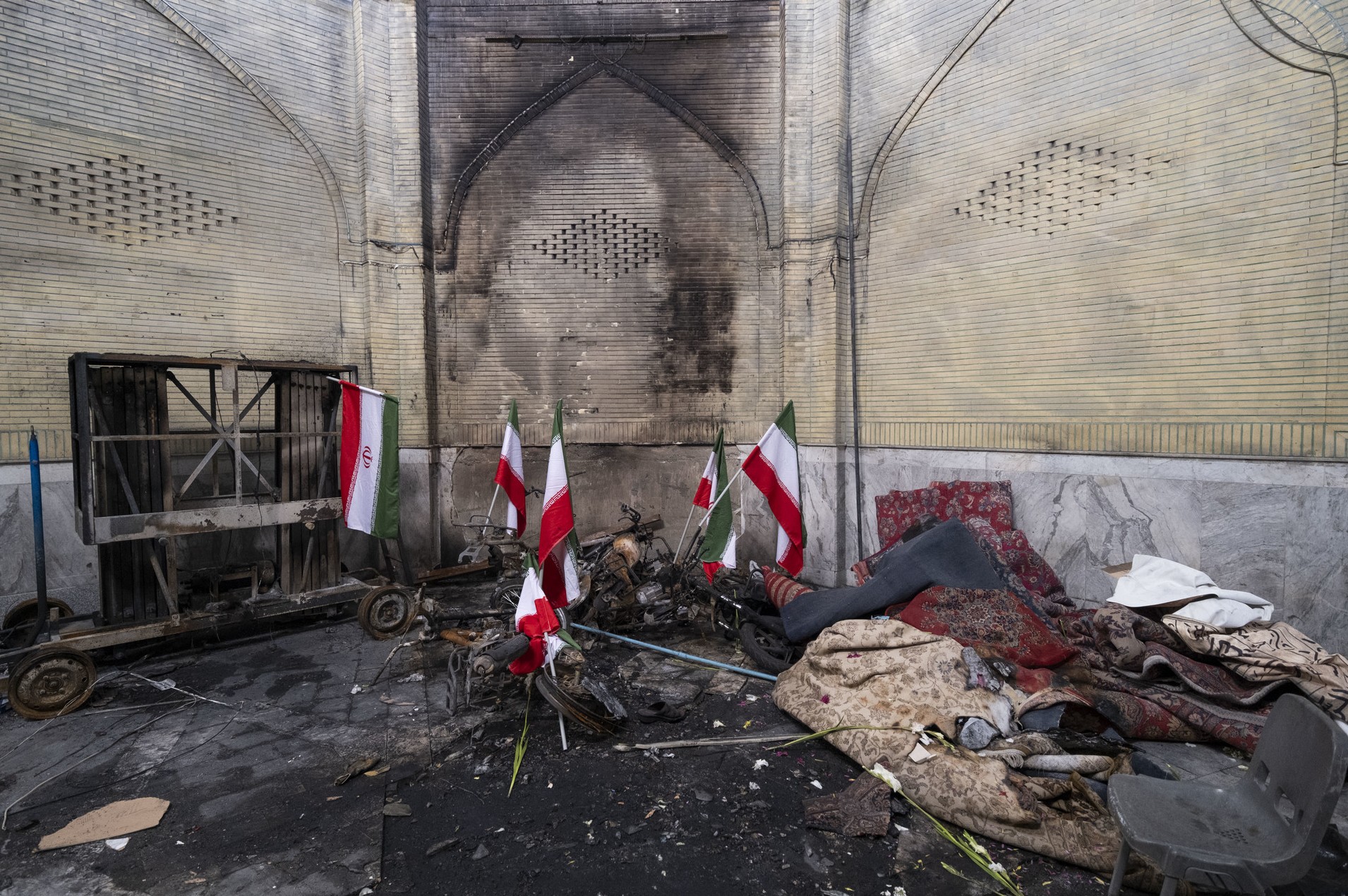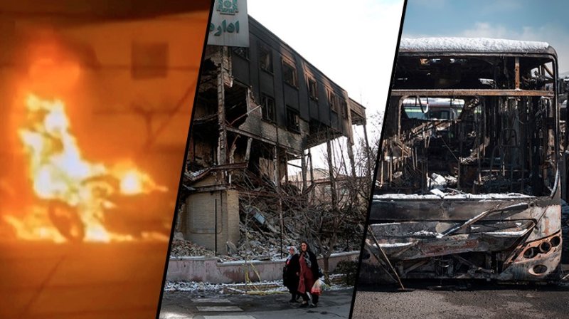 Сторонники боевиков поджигали полицейские машины и фургоны КСИР, рушили мечети и снимали с флагштоков государственные флаги Ирана, сжигали их. Камеры уличного наблюдения зафиксировали и организованную раздачу бунтовщикам огнестрельного оружия.