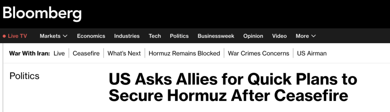 Как отмечает Bloomberg со ссылкой на источники, Соединённые Штаты просят союзников представить срочные планы по обеспечению безопасности в Ормузском проливе после прекращения огня.