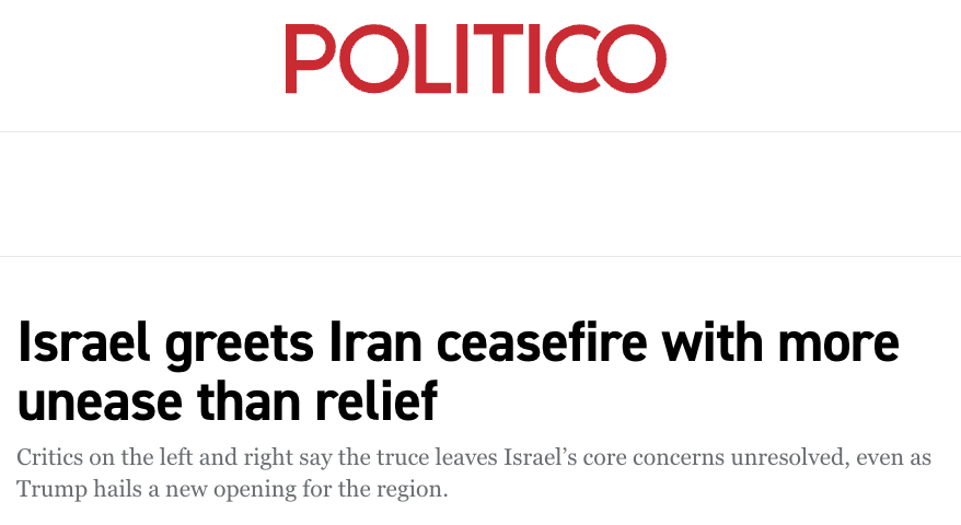 «В реакции Израиля на прекращение огня с Ираном больше тревоги, чем облегчения: ночной ракетный огонь, жёсткая критика в политической сфере и глубокий скептицизм по поводу намерений Тегерана усиливают общее ощущение, что в конфликте, может, и наступила пауза, но до его завершения ещё очень далеко», — пишет Politico.
