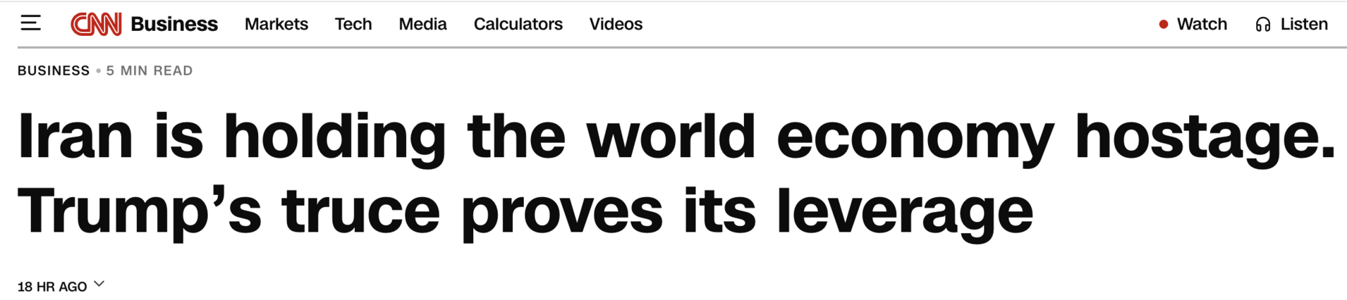 Со своей стороны, CNN пишет, что Иран держит мировую экономику «в заложниках», а перемирие, объявленное Трампом, демонстрирует, какое влияние имеет иранская сторона. Как говорится в материале, тот факт, что прекращение огня зависит от согласия Ирана вновь открыть жизненно важный водный путь, является молчаливым признанием влияния Тегерана на самый важный в мире нефтяной перевалочный пункт, а значит, и на значительную часть мировой экономики.