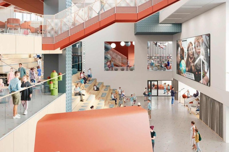 "Современное пятиэтажное здание общей площадью 20 тысяч м² вместит 1100 учеников с 1-го по 11-й класс. На первом этаже будут находиться общественные пространства для отдыха и занятий: медиатеки, а также трансформируемые спортивные залы. В атриуме смогут проводить лекции, дискуссии и выставки. На втором этаже разместят учебные кабинеты для начальной школы, обеденные залы и ещё одну медиатеку", – сообщили в мэрии.