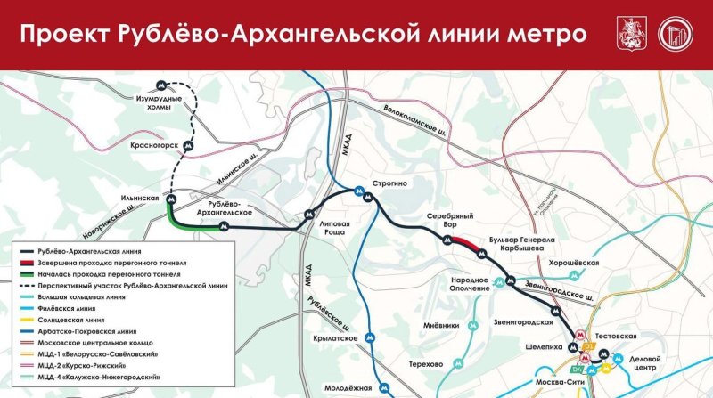 В мэрии Москвы напомнили, что Рублёво-Архангельская линия соединит Красногорск с деловым центром "Москва-Сити". Её общая протяжённость составит 27 километров, число станций – 12. С ветки можно будет пересесть на МЦД, БКЛ, Солнцевскую, Филёвскую и Арбатско-Покровскую линии.