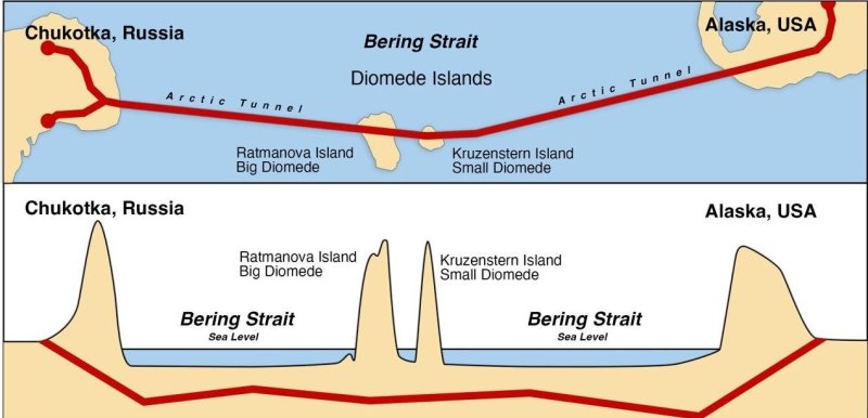По данным СМИ, тоннель между Чукоткой и Аляской будет примерно в два раза длиннее Евротоннеля между Францией и Великобританией.