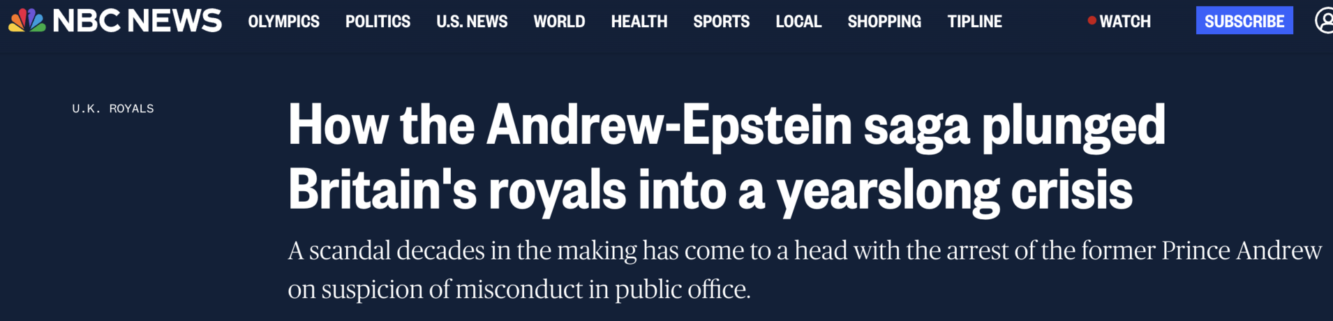 Как отмечает американский телеканал NBC News, «эпопея об Эндрю и Эпштейне погрузила британскую королевскую семью в многолетний кризис». Назревавший десятилетиями скандал «достиг своей кульминации с задержанием экс-принца» по подозрению в злоупотреблениях служебным положением, сообщает NBC.
